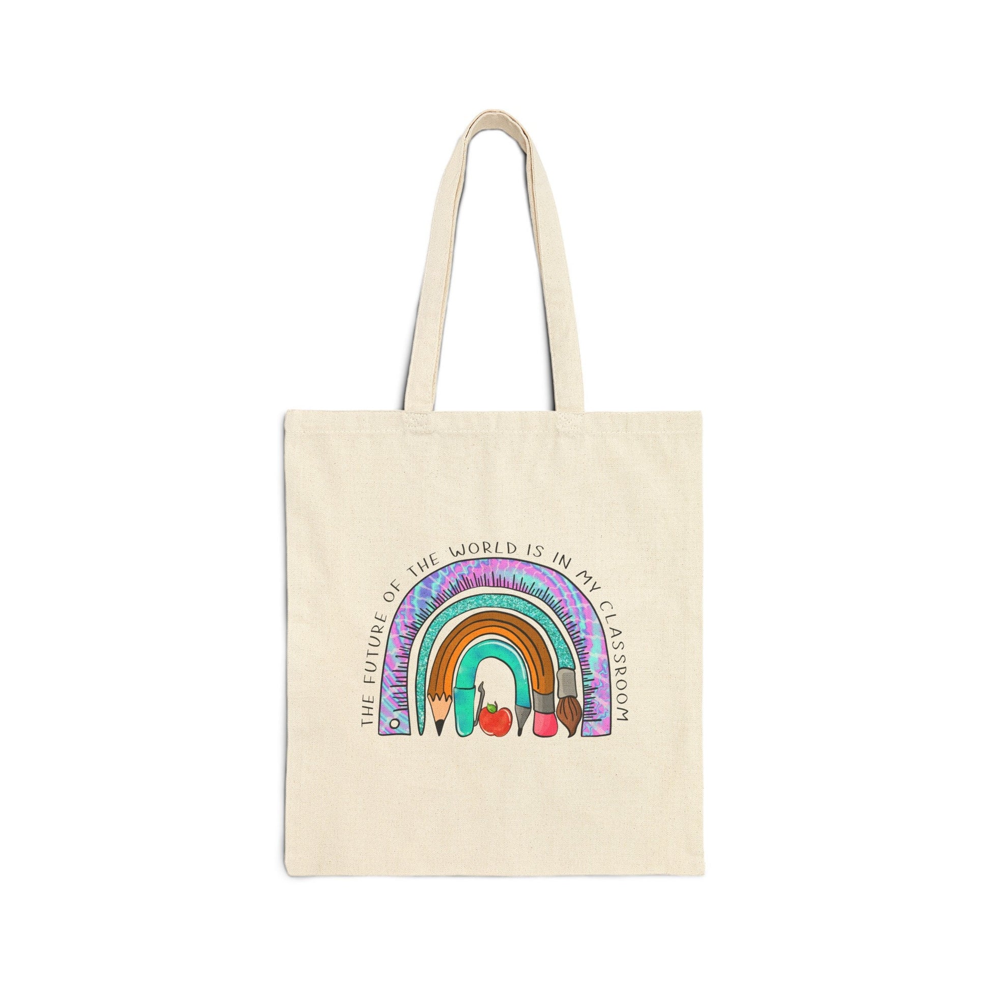 The Teacher Appreciation tote bag is designed with vibrant colors and a uplifting message to show gratitude for educators. Imagine a sturdy canvas tote adorned with playful illustrations of books, apples, pencils, and other symbols associated with teaching. The bag features phrases "The Future Of The World Is In My Classroom" in a cheerful font.